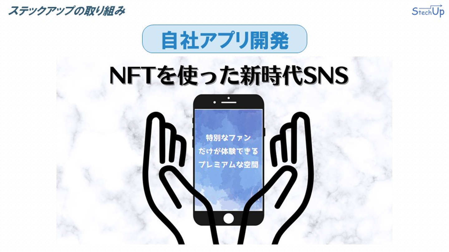 ステックアップでは副業として「自社アプリ開発」を行っています。アプリ名は「プレコミュ」です。「プレコミュ」は「NFTを使った新時代SNS」をコンセプトとしたSNSアプリです。もし興味があれば、ステックアップのホームページにプレコミュ開発ブログをご参照ください。