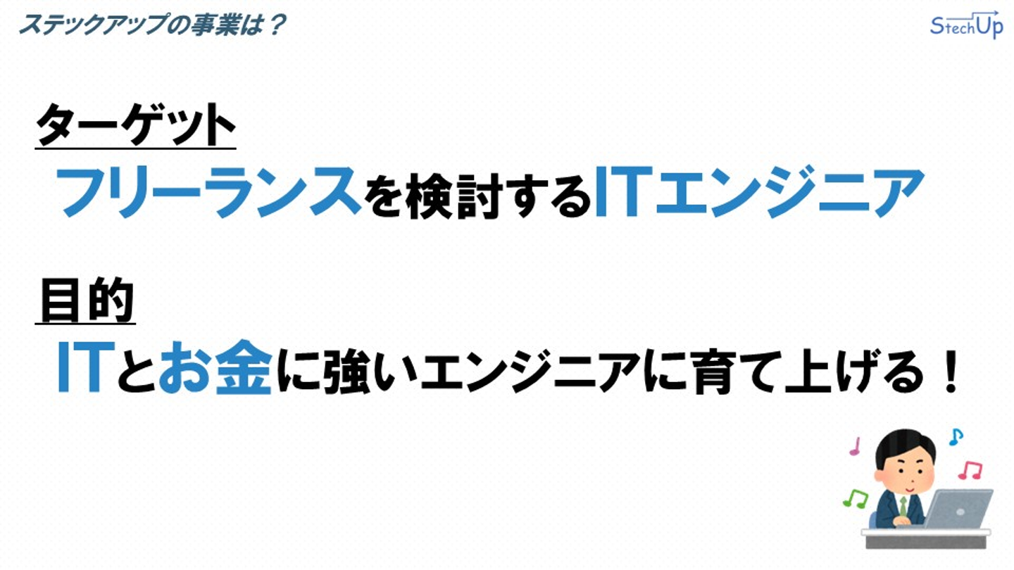 ステックアップは、フリーランスに興味があり、将来的にフリーランスになってみたいと考えている方々に向けて、教育事業を行っています。立派なフリーランスのITエンジニアになっていただくために、ステックアップは「ITとお金に強いエンジニアに育て上げること」を目的として活動を続けています。