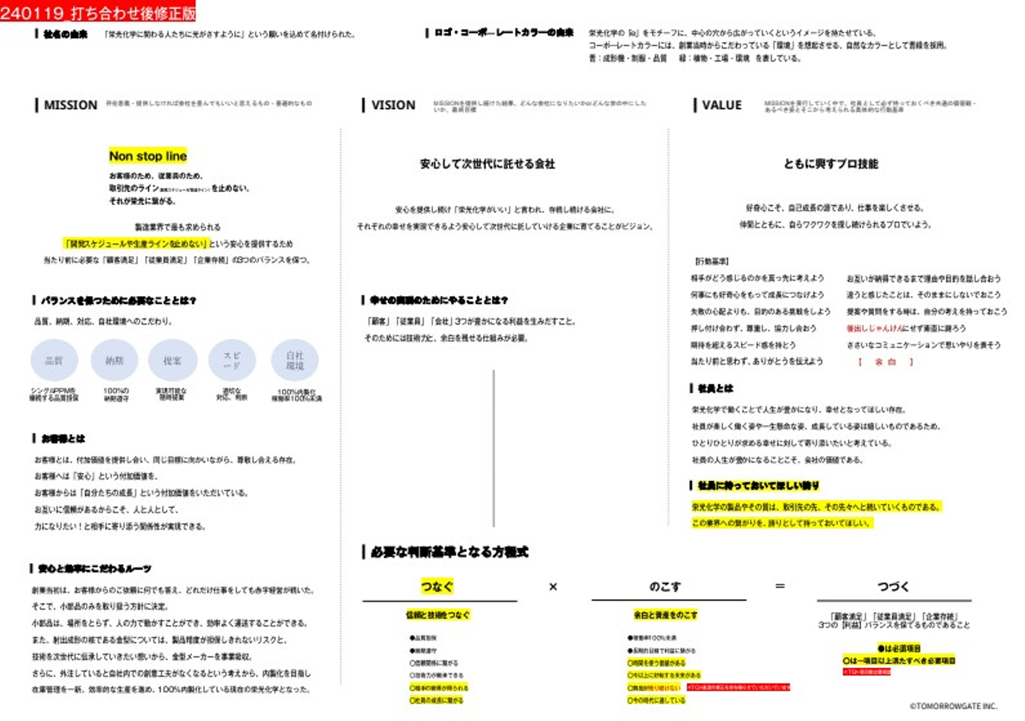そんなような事を表面的なカッコつけの言葉ではなく、本当に心の奥にある部分や、会社の歴史を振り返りながら数か月に及ぶ地道な工程でした。半年ほど経過してようやく骨子として下記のような形にまで起こすことができました。そこからトゥモローゲートさんにてデザイン化していただいた栄光化学のビジョンマップの完成に至りました。