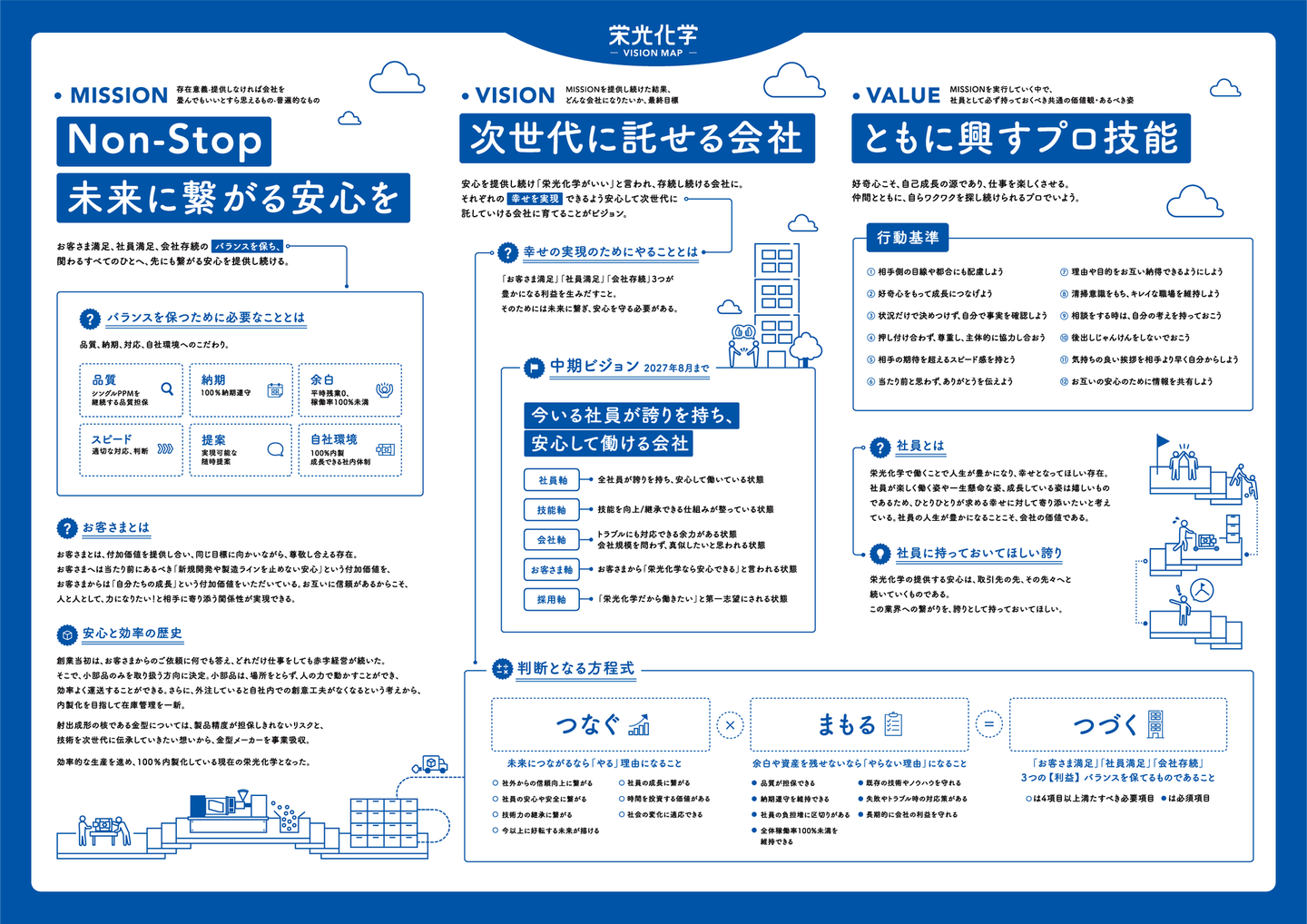 お客さまの安心や、社員の安心のために、全力でMISSIONにコミットして、「あの会社に仕事を任せたら安心だよね」「栄光化学で働いていたら安心だよね」とあらゆる人に思っていただける会社を目指していきたいと思います。そして、このストーリーが栄光化学の新たな進化の第一歩になることを願って、結びとさせていただきます。