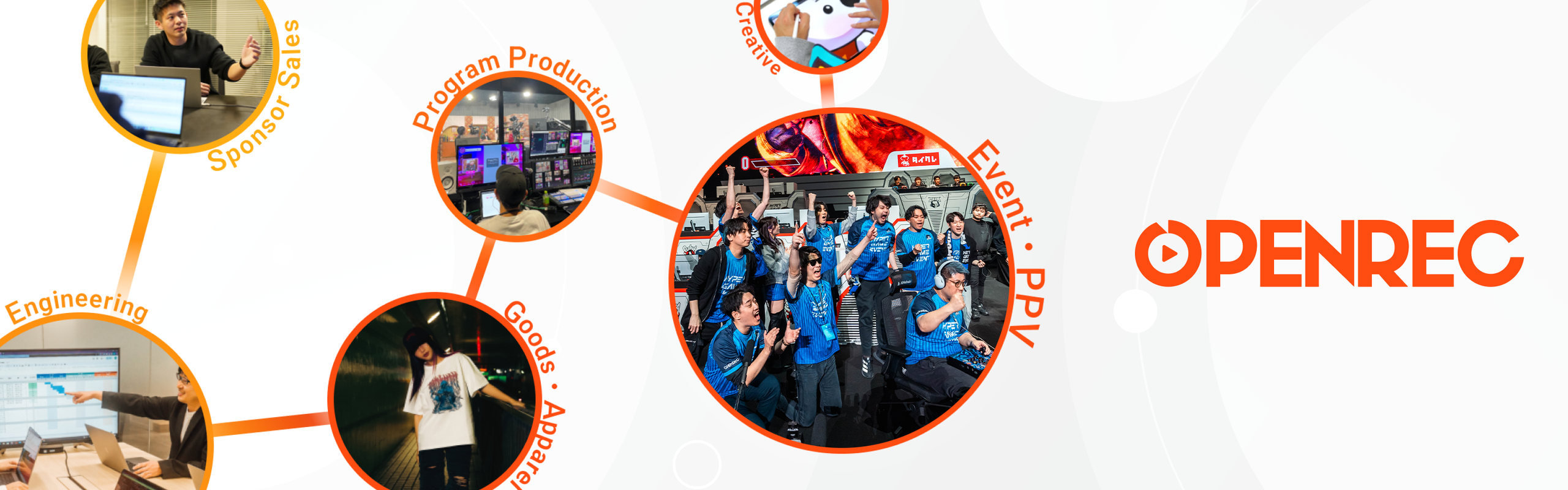 OPENRECが手掛けるサービスは、番組・イベント・グッズ・スポンサード、プラットフォーム運営等、多岐に渡ります。配信者の方々とともにユーザーの期待を超える価値を生み続けるため、ビジネス・エンジニア・デザイナーすべての職種がワンチームとなることが必要不可欠であると考えています。