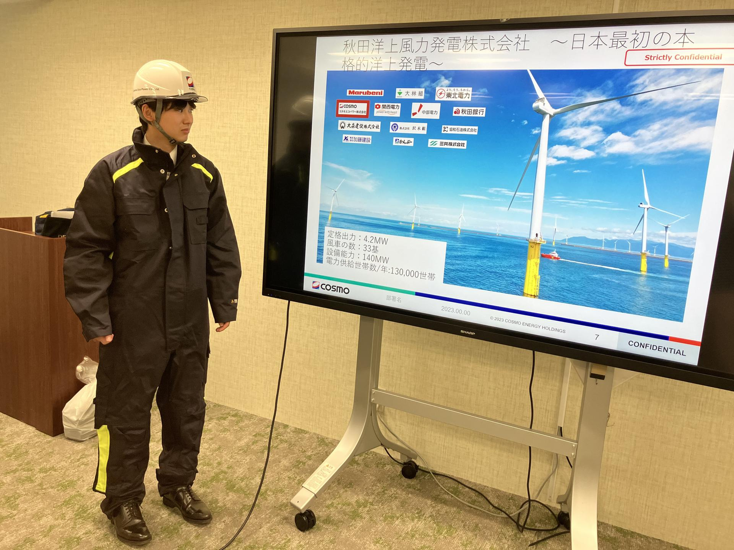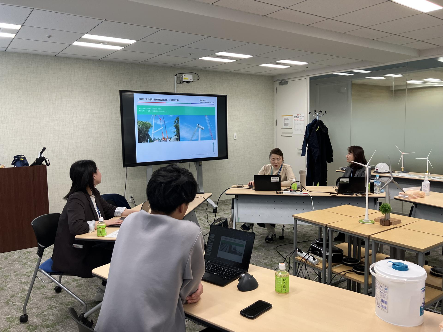 当社の事業内容はもちろん風車建設における大まかな流れの説明だけでなく、実際の現場での様子を映像を通して体感していただきました。