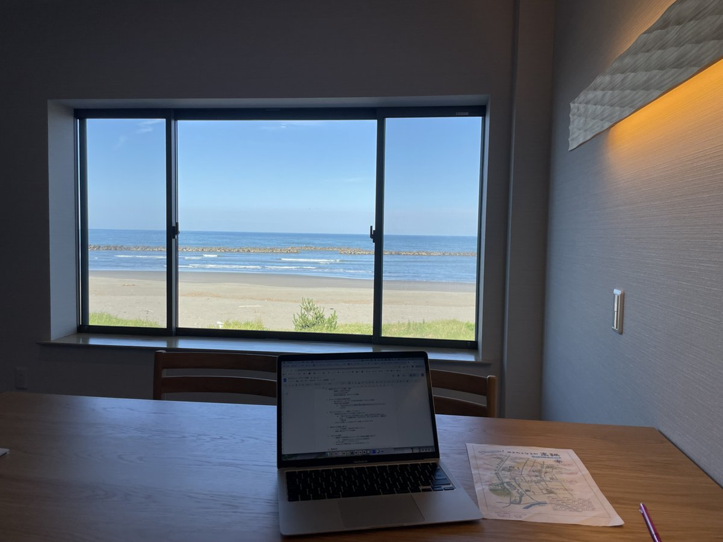 窓枠いっぱいの海を眺めて、波の音を聞きながら仕事できる環境。