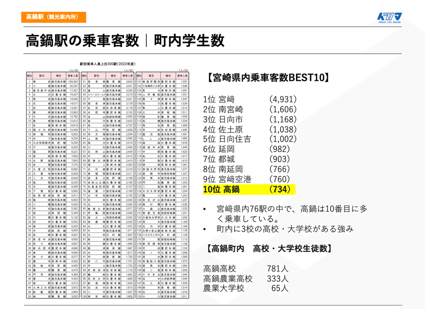 ちなみに、宮崎県内の乗車客数を調べてみると、高鍋駅は町の規模の割に県内10位と検討。