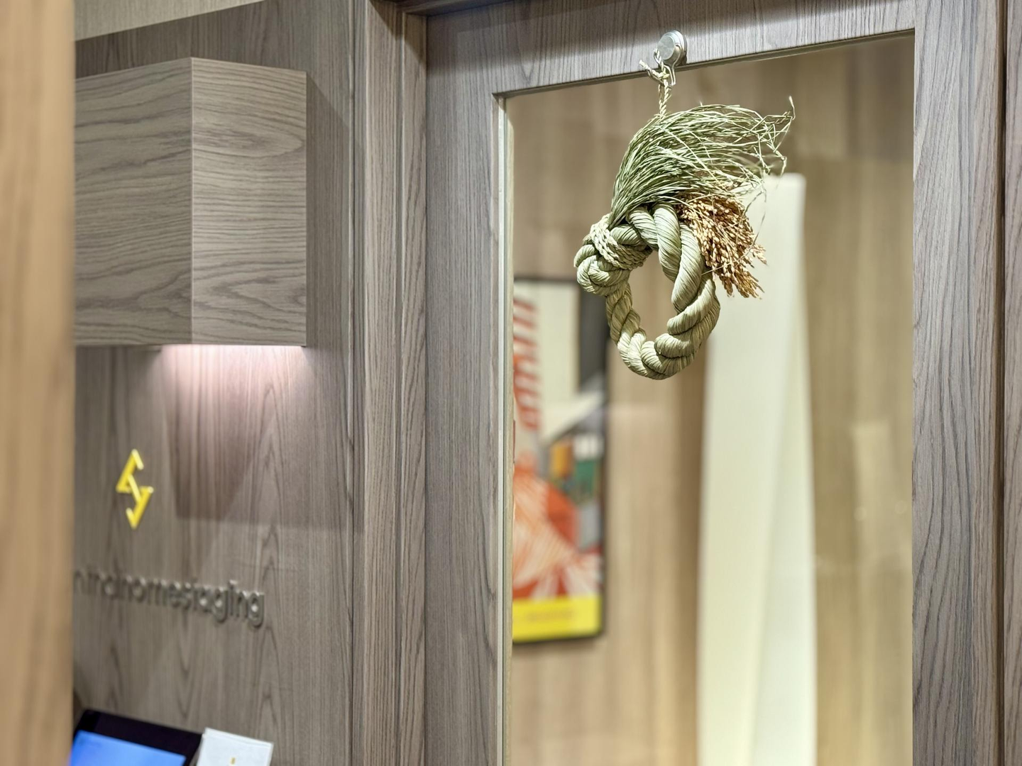 豊穣や健康、商売繁盛などの象徴として、ふさふさの稲穂が添えられた、エントランスのしめ飾り。今年もみんなで繁栄発展できますようにと願いを込めて。