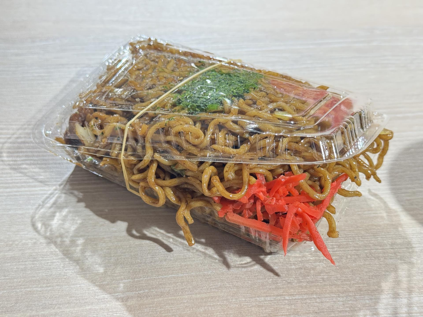 パックからはみ出す、躍動感あふれる焼きそば。しっかりめの味付けで、美味しかったです。