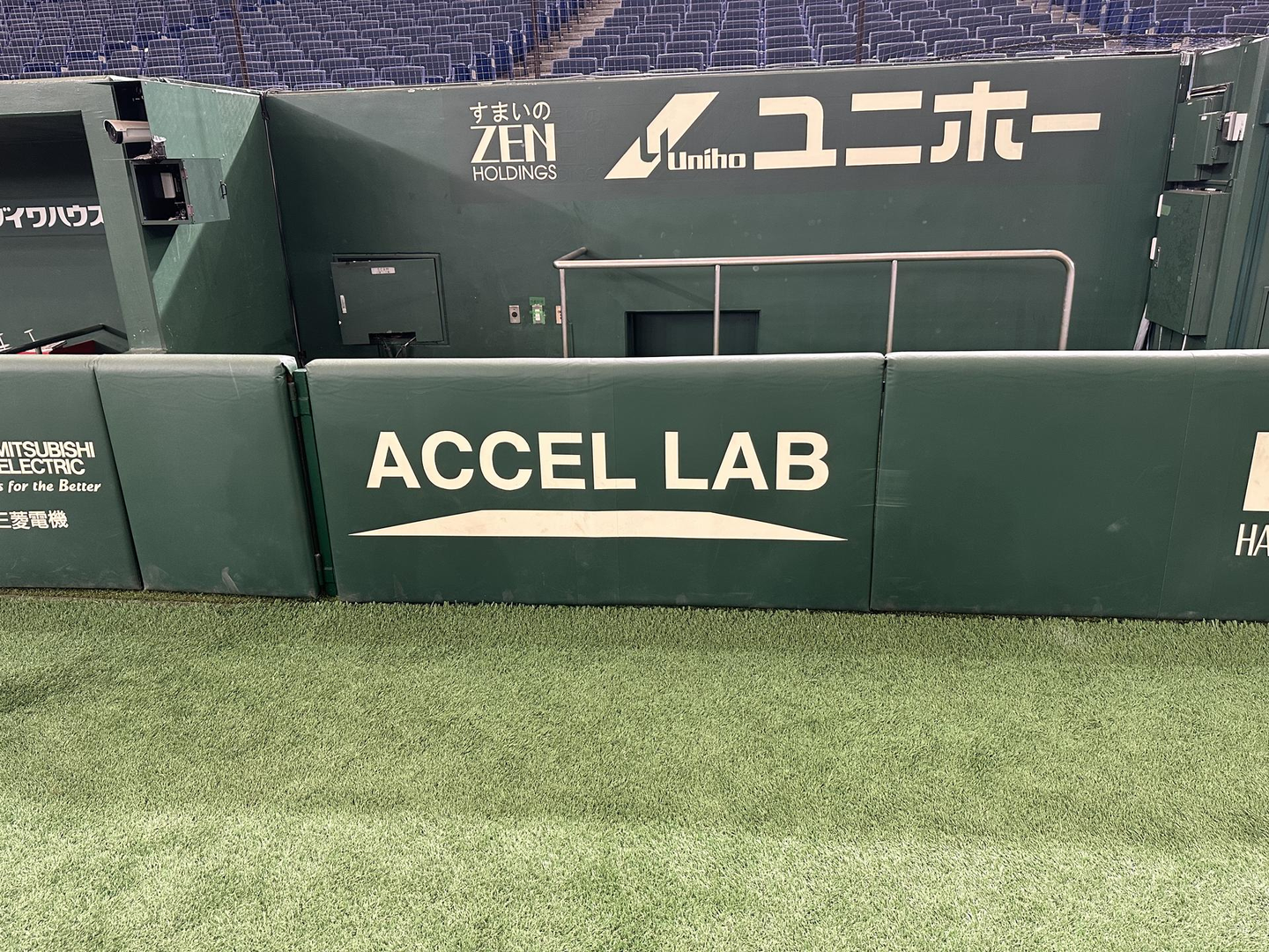 アクセルラボの企業ロゴが入った広告看板は、3塁側カメラマン席防球フェンスに掲出されています。