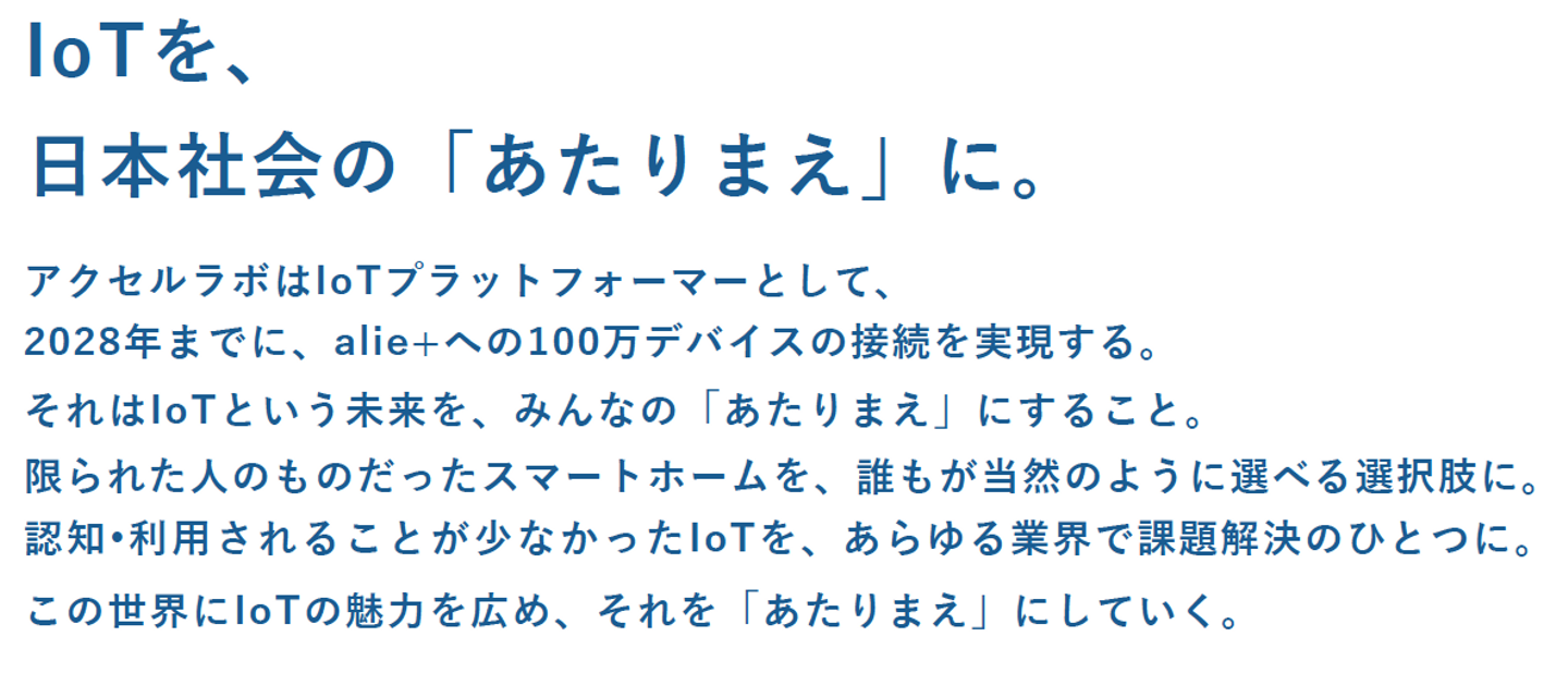こんにちは!アクセルラボの広報です。アクセルラボは、住宅をスマートホーム化する「SpaceCore(スペースコア)」や、その中核となるIoTの技術「alie+(アリープラス)」を住宅や住宅分野以外に提供しているスタートアップです。