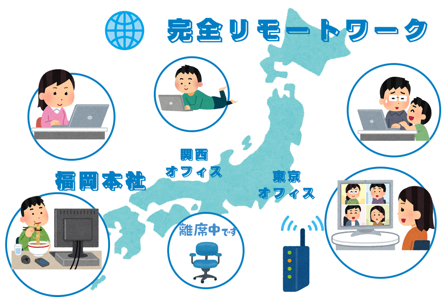 <拠点>福岡本社、東京オフィス、関西オフィス(完全リモートワーク)