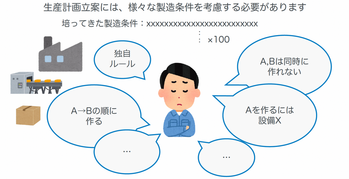 製造業の企業が実際に工場を稼働している中で、全く制約条件を把握していないということはあまりないと思います。実際、お客様との会話では「こういう制約条件がある」と教えていただけます。一方で、多くのシステムの導入事例では制約条件の「抜け漏れ」や「例外」が発生しています。
