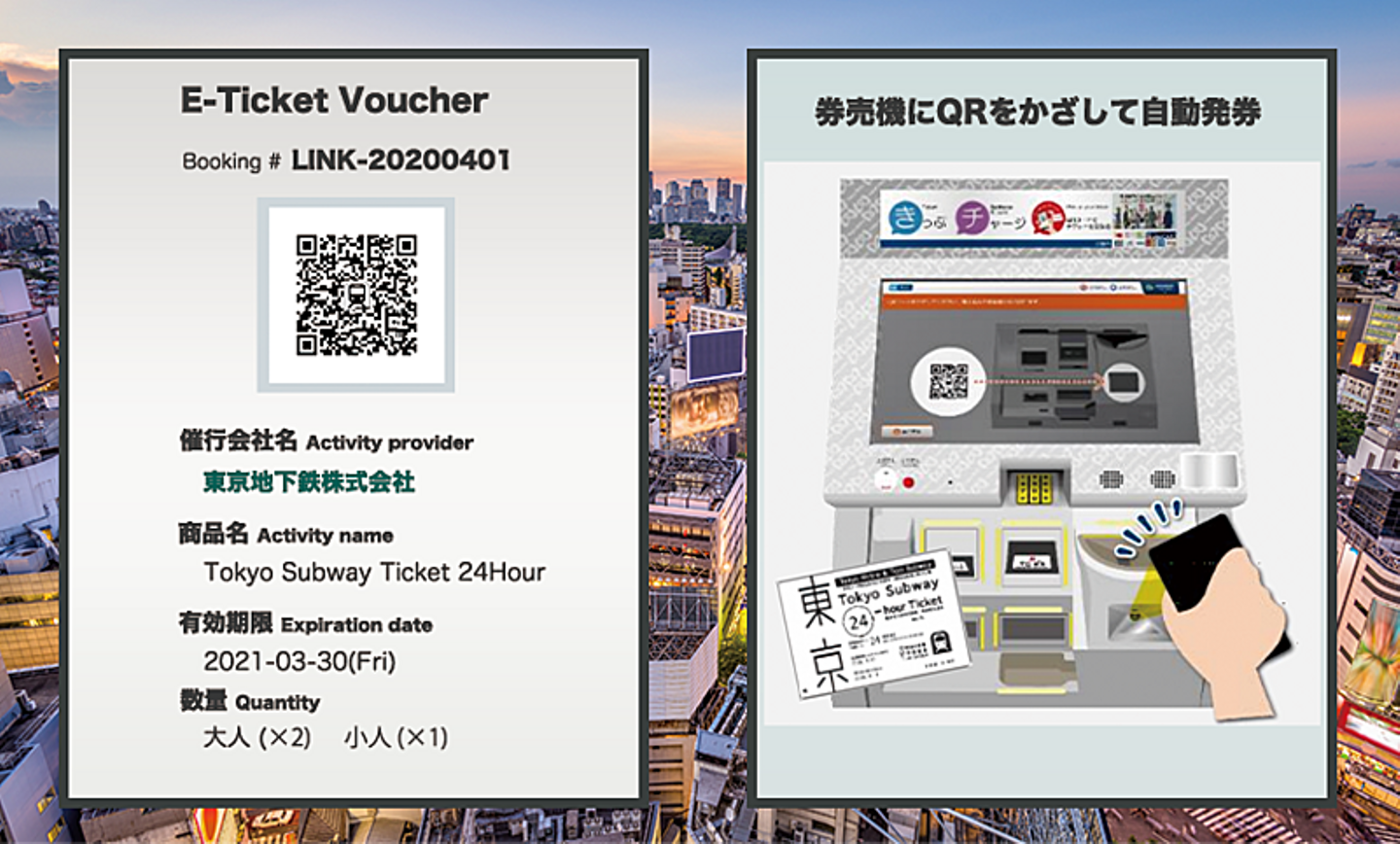 リンクティビティはQRコードの活用によって、サプライヤー、販売する旅行会社、そして旅行者を結びつけることで、その課題を解決する。旅行者は、OTAなどのサイトでチケットを購入すると同時にQRコードを取得。交通機関の企画チケットの場合、そのQRコードを使って、実券との引き換えだけでなく、駅券売機からの発券またはそのまま改札自動入場することができるようにした。
