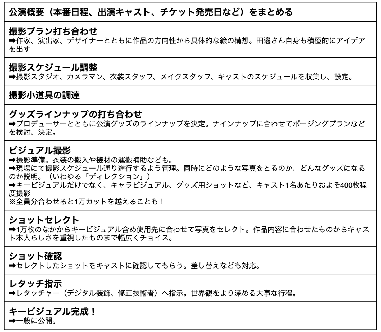 公演の顔となるキービジュアル。作品の内容も想起させつつ、主要キャストの魅力もふんだんに表現するために、田邊さんが行っていることを時系列で並べてみた。