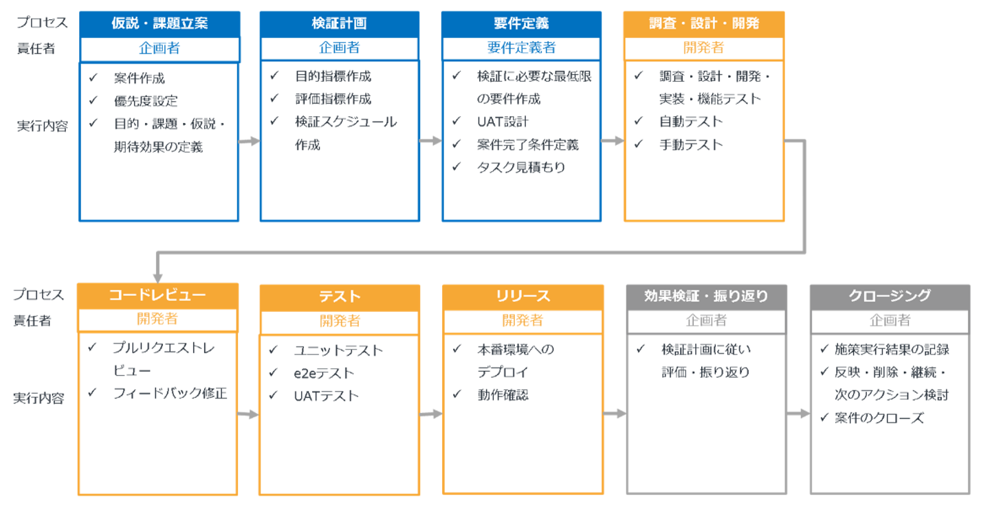 以下が当社における一般的な開発のプロセスですが、オレンジに色付けされているプロセスには基本的にすべてのエンジニアに関わっていただきます。