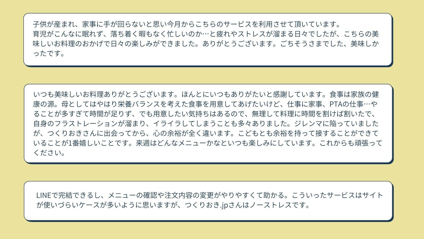 当社のサービスはお客様の利用頻度が高く、かつ本当に困っている課題を解決するサービスということもあり、毎日のようにお客様の声に直接触れることができます。日本の家庭では平均的に毎日90~120分食事の準備に時間が使われており、その時間を短縮してゆとりを生み出すサービスなので多くの方から大変喜んでいただいています。毎週、お客さまからは多くの感謝のコメントをいただいています。