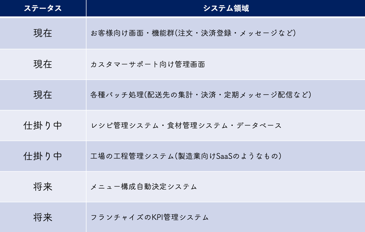 (ステータス=現在:既に稼働中のシステム、仕掛中:要件定義・実装中、将来:近い将来開発する可能性あり)