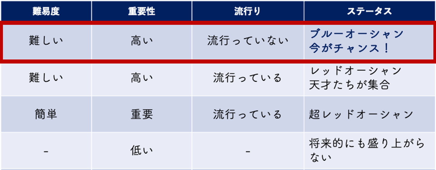 たとえば、「簡単重要流行っている」領域は誰もがチャレンジするため完全にレッドオーシャン化して希少価値が出しづらい状況になります。また、「難しい重要流行っている」領域についても世界中の天才たちが集まってくるので、その中で重要な人物になることはなかなか難易度が高いです。