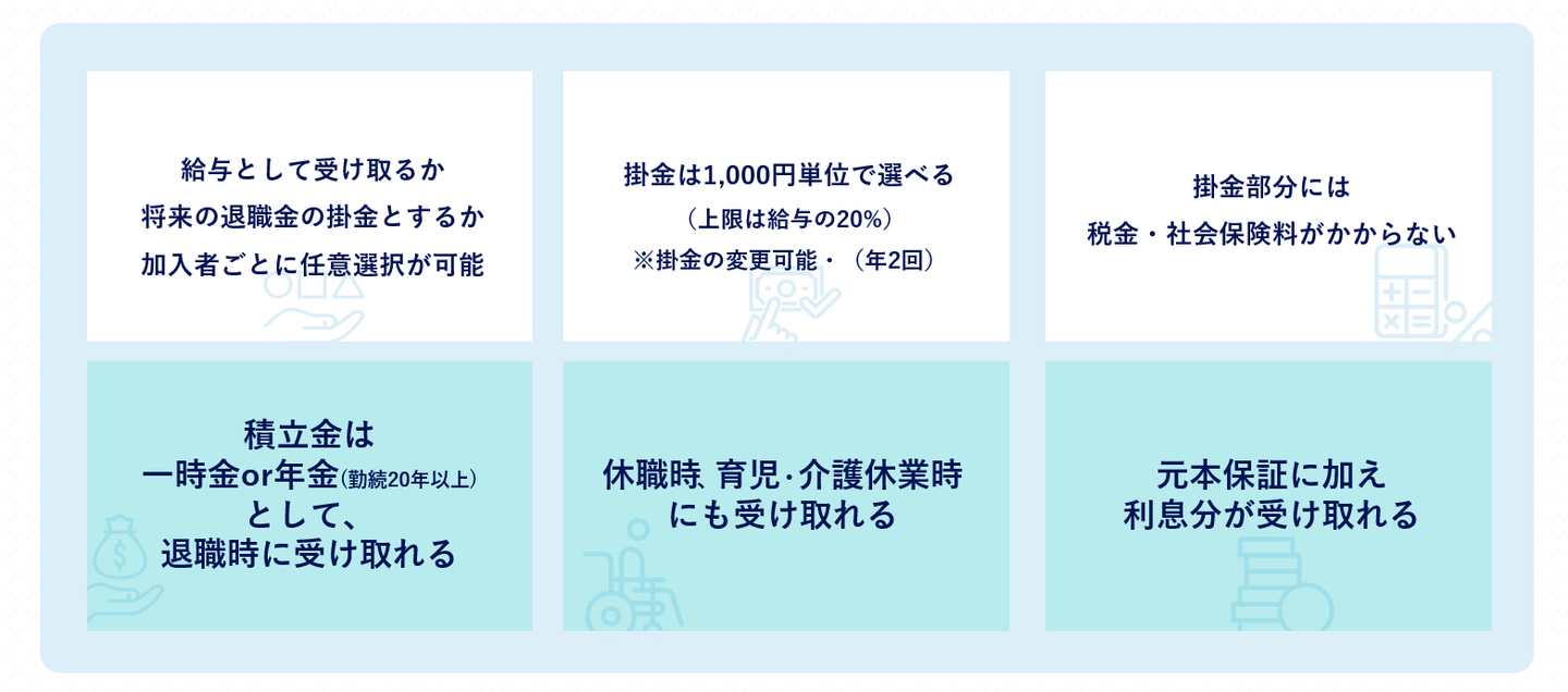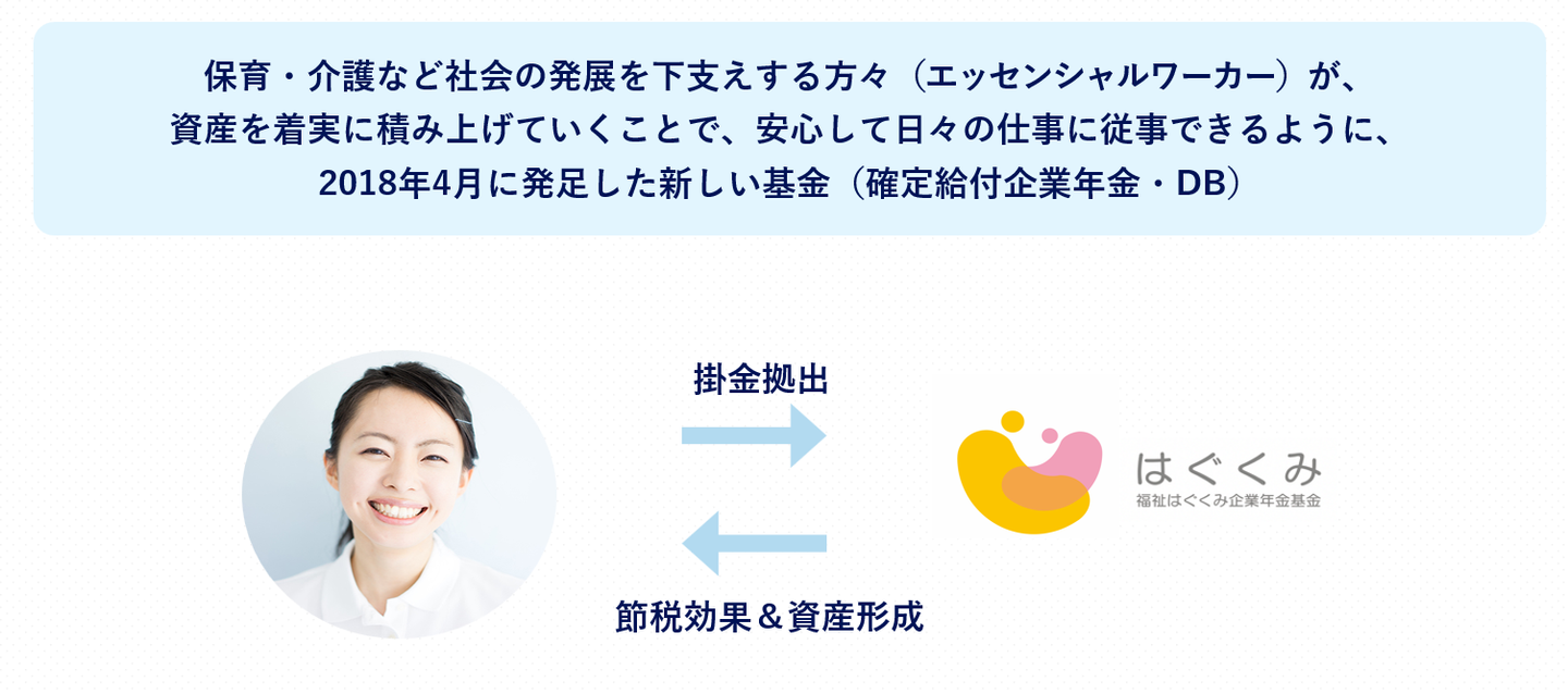 社会の発展を下支えする人たちの資産形成や福利厚生を支援するために、2018年に発足した新しい年金制度(確定給付企業年金)です。60歳まで引き出しができない確定拠出年金制度とは違い、退職時や休職時、育児・介護休業時に受け取ることができることや、1000円~基本給/役員報酬の20%(上限100万円/月)の範囲の中で1000円単位で掛け金を選択できるなど、従業員の皆さんのメリットが多々あるサービスです。
