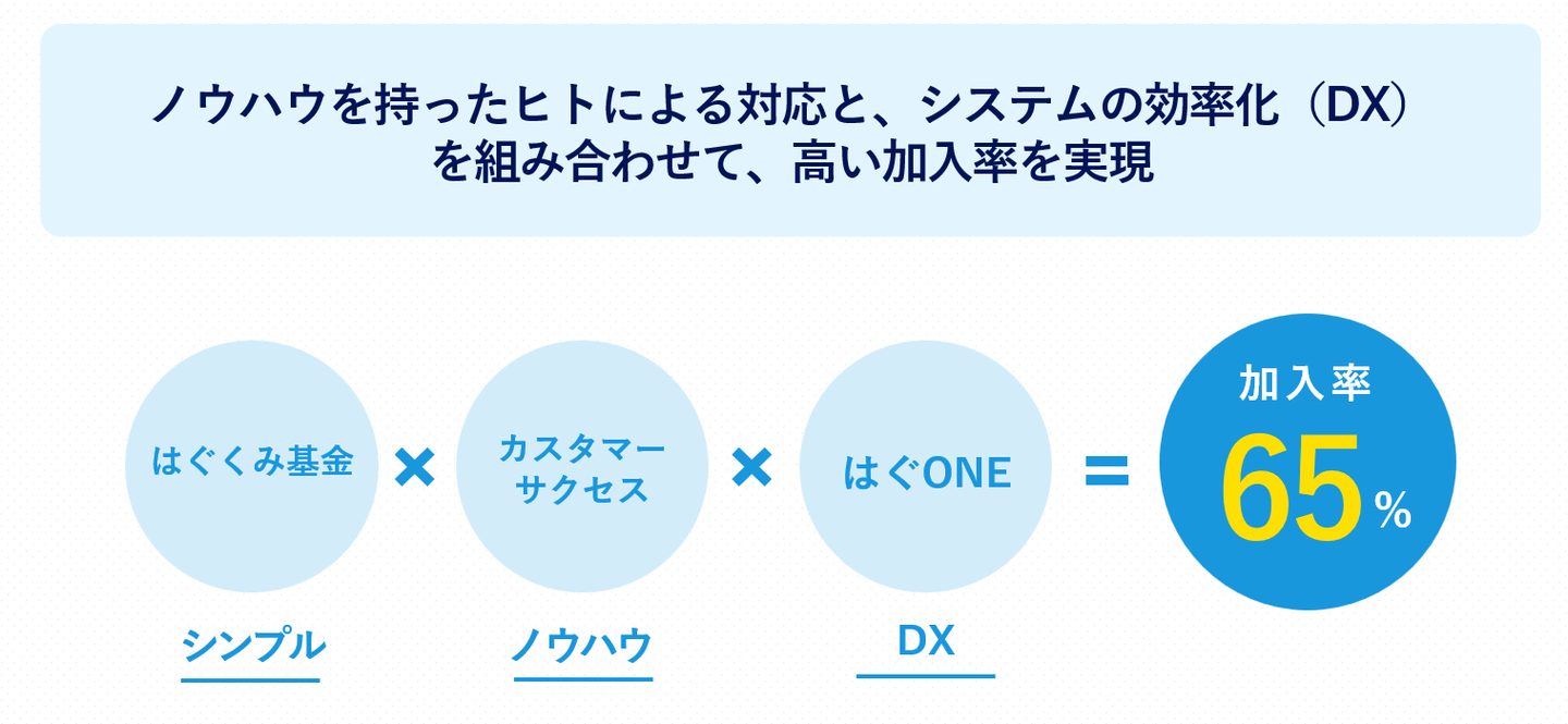 制度導入後、従業員の加入率が高いこともベター・プレイスの強みです。いくら良いサービスでも使ってもらわないと意味がないですよね。導入して終わりではなく、しっかりと従業員ひとりひとりにご理解いただき、納得して加入いただいています。確定拠出型年金制度の平均加入率が15%(※自社調べ)ですので、4.3倍の効果を出し続けています。