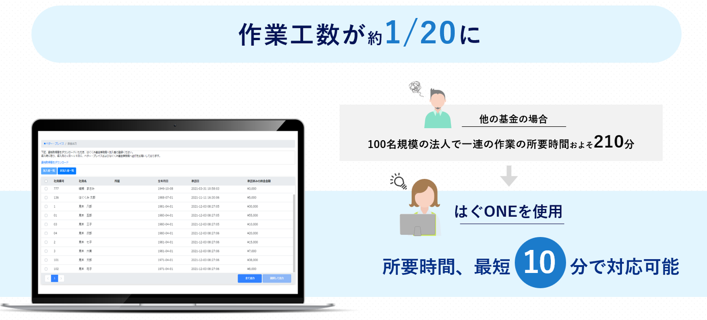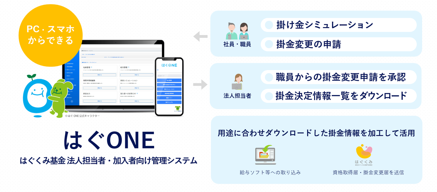 はぐくみ基金 法人担当者・加入者向け管理システム「はぐONE」を自社開発し、掛金申請や資格情報の管理工数を削減しています。誰でも簡単に退職金を積立てることができる仕組みを提供しています。
