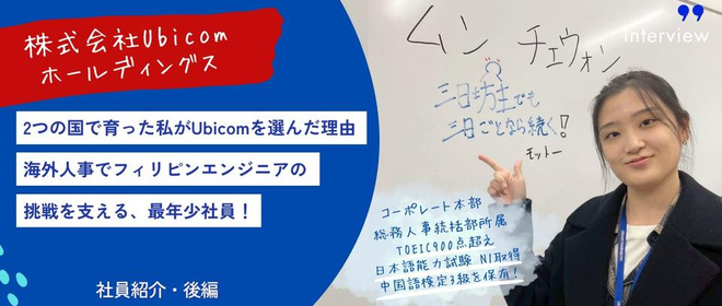 こんにちは!Ubicomホールディングス採用担当です。引き続き、コーポレート本部 総務人事統括部所属のムン・チェウォンさんにお話をお聞きしました!中編では、ムンさんが日々どのように海外人事の業務に取り組んでいるのか、その裏側に迫ります。【社員プロフィール】:ムン チェウォンさんコーポレート本部 総務人事統括部所属。2025年入社。日本の難関大学を卒業し、TOEIC900点超え、日本語能力試験(JLPT)N1・中国語検定(HSK)3級を保有!※日本語能力試験(JLPT)N1とは日本語能力試験(JLPT)の中で最も難しく、2,000以上の漢字と10,000以上の語彙を覚えなければならない政治...