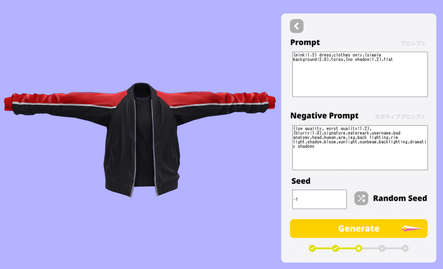 何か既存の画像があるわけではなく、ユーザーからの「こういう衣装が欲しい!」といった要望をもとにテクスチャなどを作り上げていくので、AIを最も活用できる部分です。AIが学習した大量の画像の要素と、プロンプトとして入力されるテキストの情報とを紐づけています。