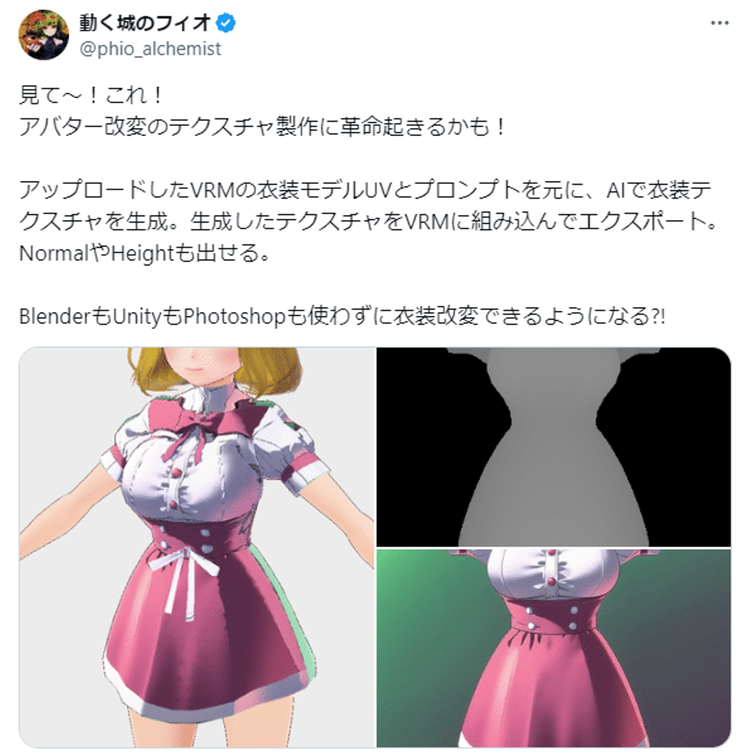 2023年にオープンβ化された、AI衣装テクスチャ生成サービス「ThreadTale(スレッドテイル)」の開発に尽力。複雑で時間もかかる3Dアバターの衣装改変を、プロンプトを入力するだけであっという間に実現できると、アバターでバーチャル空間を楽しむユーザー層に注目されています。