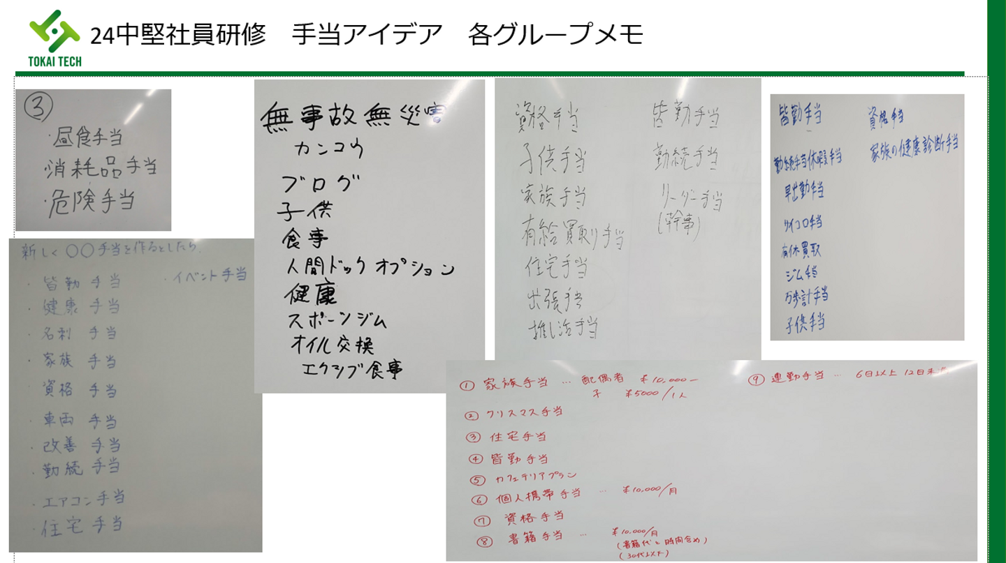 山本さん:「新しく手当を作れるとしたらどんな手当を作りますか?」というお題で、アイデアだしをする中堅社員研修の中でのワークです。