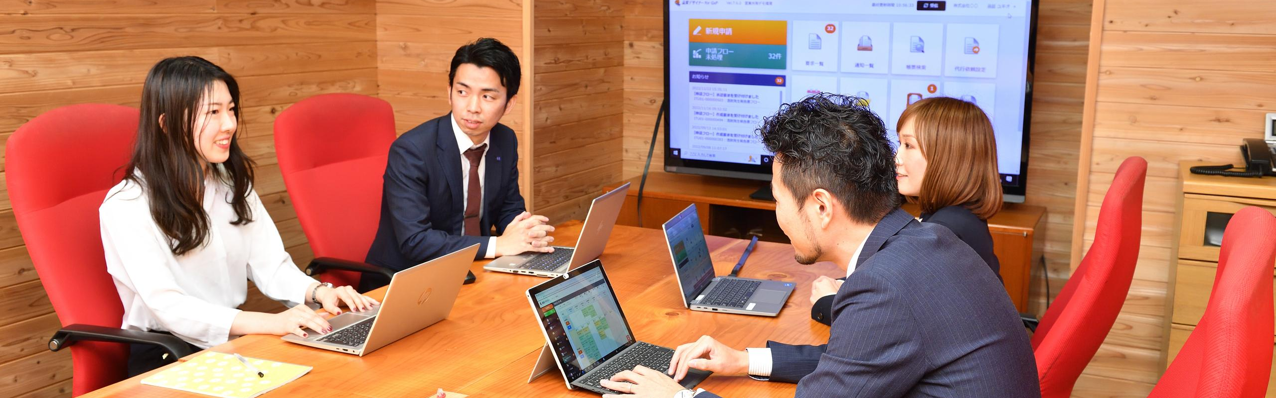 経営層も一般社員も、仕切りのない同じフロアで一緒に仕事に取り組むため、物理的・精神的な距離が非常に近く、細かくコミュニケーションを取ることが可能です。サービスの特性上、対面するお客様は経営層の方々であることがほとんど。普段から社内で経営層と話せる環境は、実際に他社への提案の際にも活きています。社員の「困ってます!」の一声に対し、上下関係なくフォローし合えるオープンな職場です。