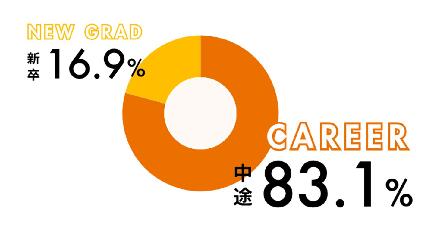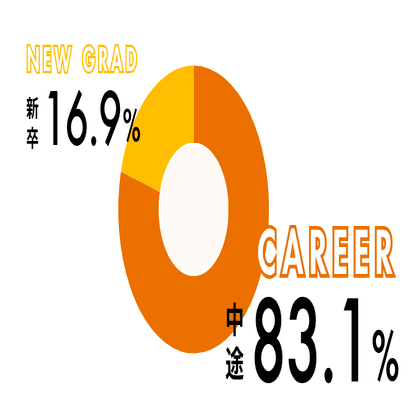 中途・新卒比率:現在は中途比率高め。新卒採用も強化中!