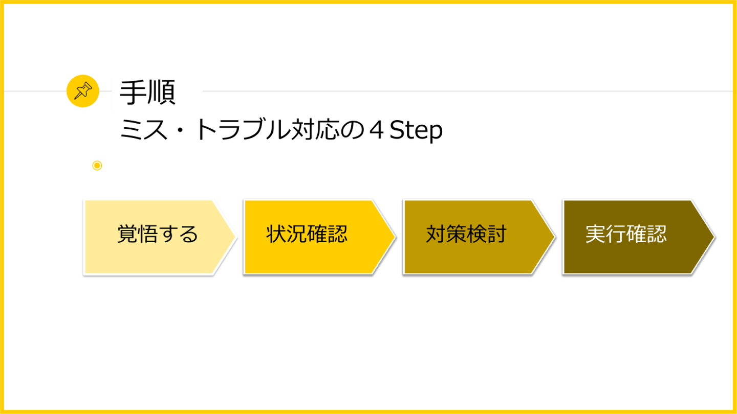 ミス・トラブル対応の4Step(覚悟する⇒状況確認⇒対策検討⇒実行確認)