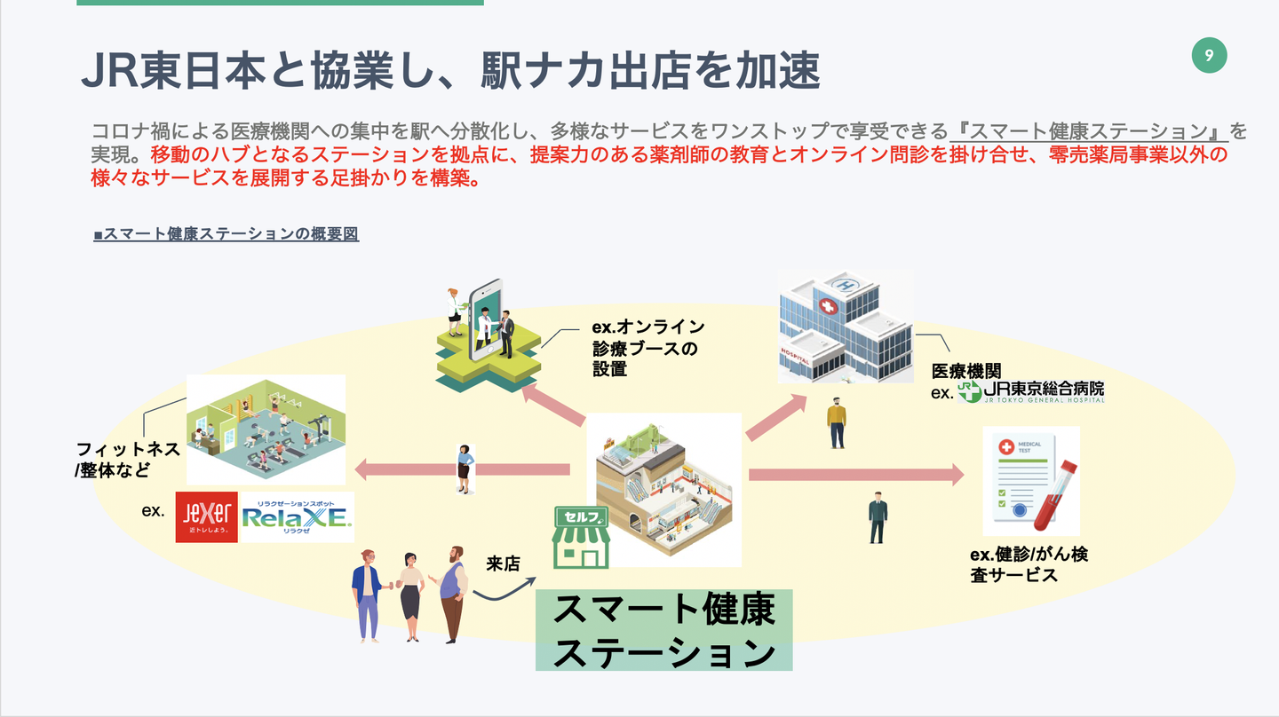 2020年11月、SD Cは『JR東日本スタートアッププログラム2020』の採択企業に選ばれました。これによりJR東日本グループとともに、零売薬局を皮切りに、オンライン診療、健診サービス、フィットネスなどを兼ね備えた「スマート健康ステーション」を実現したいと考えています。駅は移動するための拠点から、健康になるために行く拠点へ。そんな新たな駅のあり方を実現するため、新たな医療の選択肢である零売薬局を展開しています。