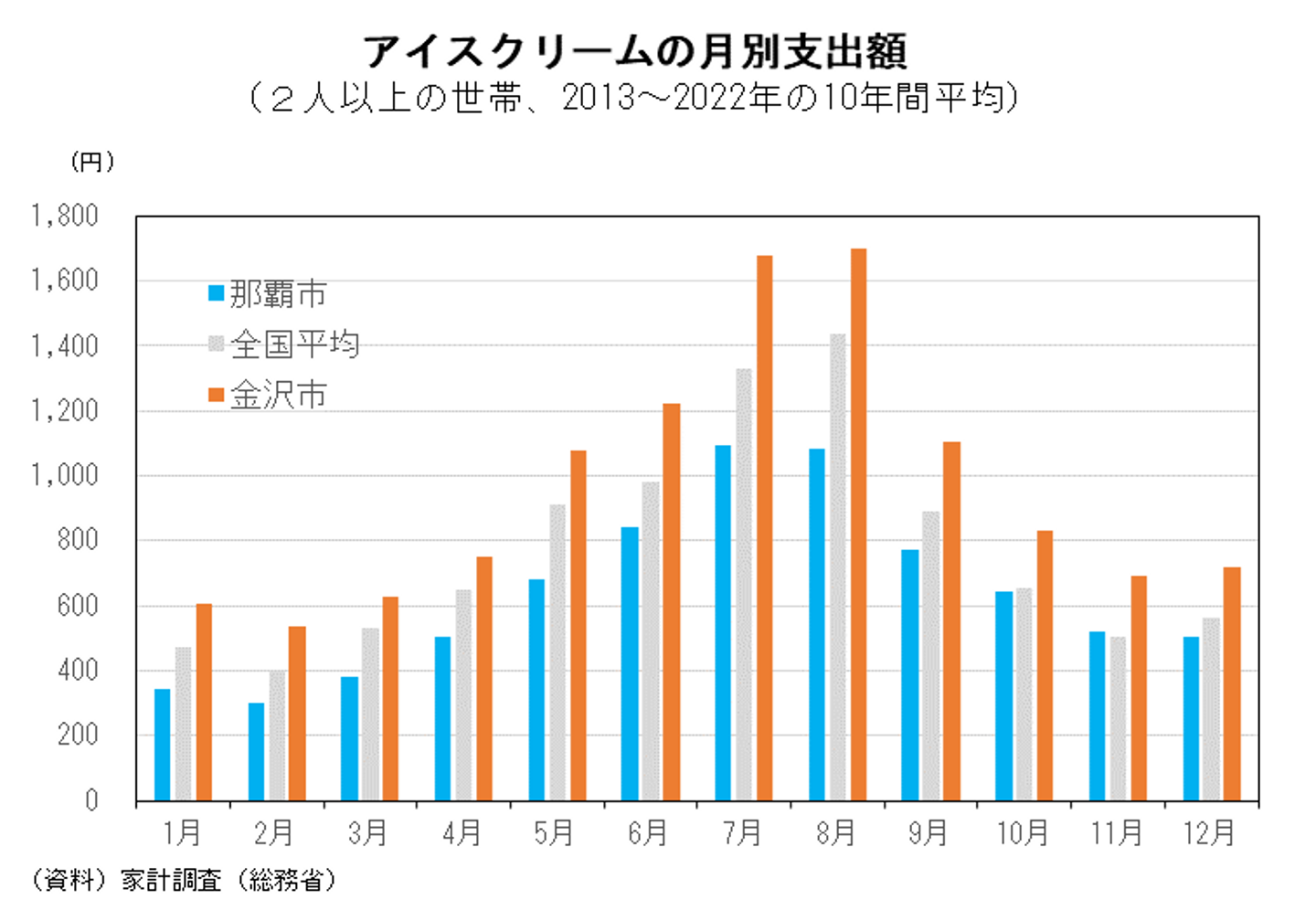 引き続いては月別の支出額ですが、こちらはやはり夏場にかけての消費、支出が圧倒的に多いですが、冬場でも全国1位の金沢市では2月でも500円以上と、年中食べている感が表れていますね( *´艸`)