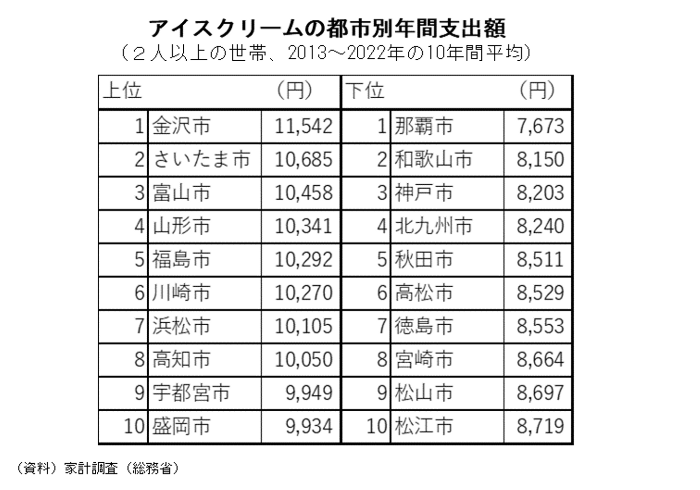 またまた、アイスクリームの話題になりますが、アイスクリームの地域別支出額について、最近10年間の平均で最も支出額が多い都市は金沢市、次いでさいたま市、富山市の順で、一方、支出額が少ないのは、那覇市、次いで和歌山市、神戸市の順になるそうです。