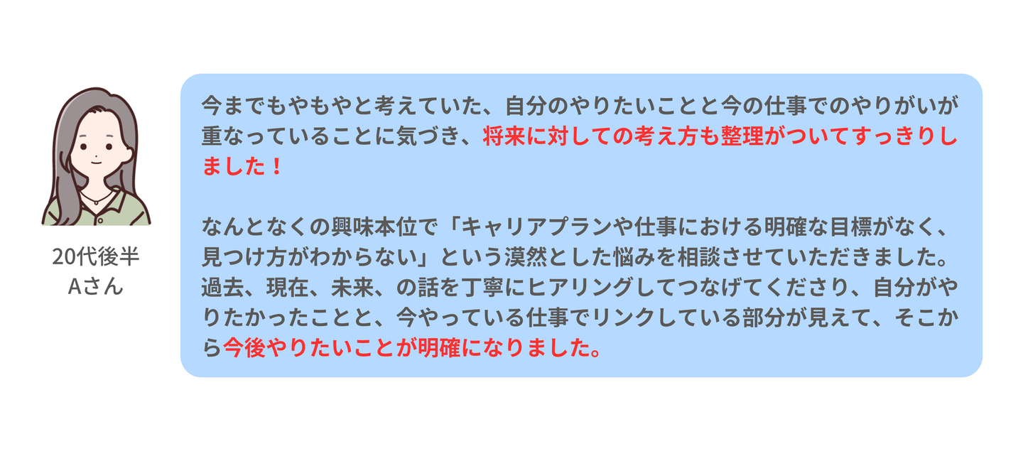 誰に話していいかわからないような、仕事やキャリアの様々な悩み。これをキャリアのプロであるキャリアコンサルタント(国家資格保有者)に相談できるサービスです。
