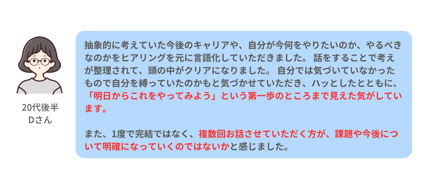 これからのキャリアや働き方を考えたいとき、家族や友人に話すこともできますが、愚痴の話で終わってしまったり、1人の経験談に頼るために自分に合っていなかったり、ときには自分の選択肢を否定されたり…