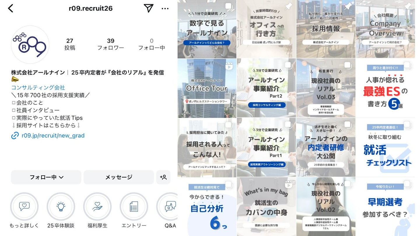 アールナインの魅力をより多くの就活生に多角的に伝えるために、新卒向けInstagramアカウントの運用を行っています。
