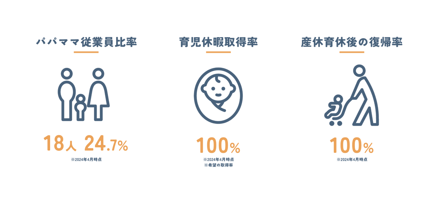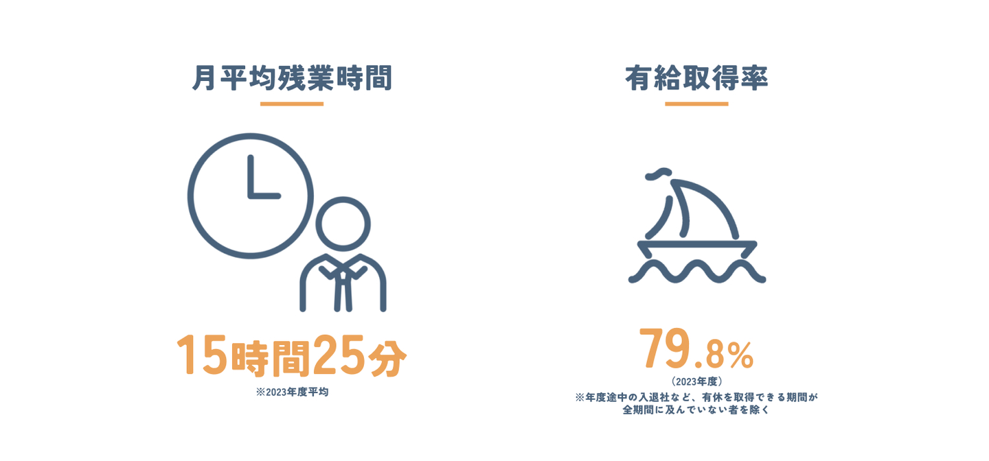 月平均残業時間は約15時間と少なく、2023年度の有給取得率は高い79.8%を記録しています。従業員が仕事に熱中できて、同時にプライベートや家族との両立もしやすい環境を整えることに力を入れています!