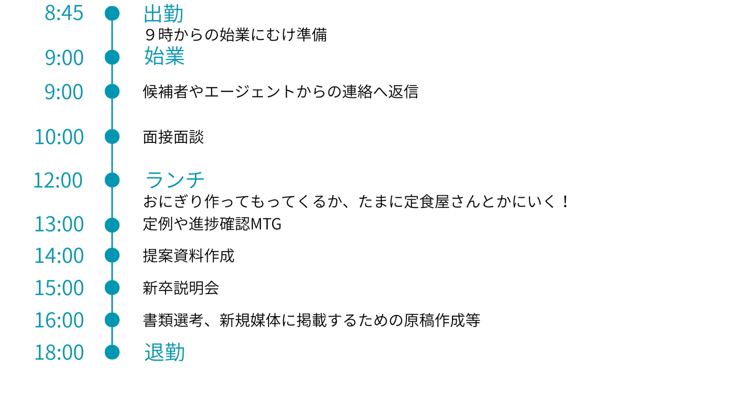 求人を出すところから、応募者の方との面談、選考の調整、入社後のフォローまで、採用に関わることは基本的に全部ですね。