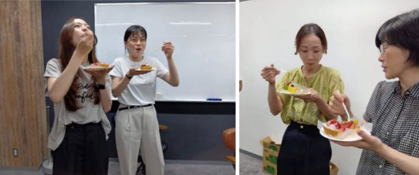 座談会の最後には、お待ちかねキルフェボンの美味しいフルーツタルト!参加者は皆、笑顔でタルトをいただきました。美味しいタルトと焼き菓子を味わいながら、山崎部長とも和気あいあい。弊社は普段から他部署とのコミュニケーションも活発で、風通しの良い企業文化がありますが、さらに社内の絆がグッと深まったと思います!