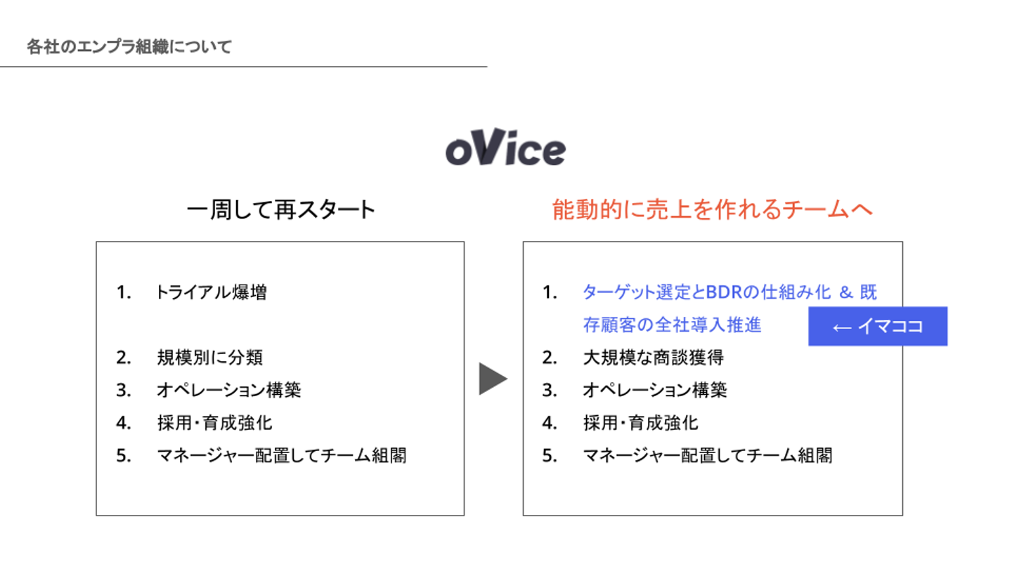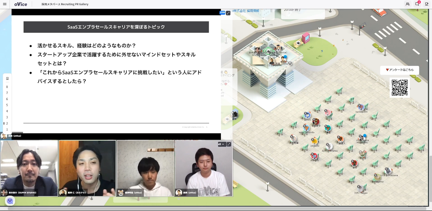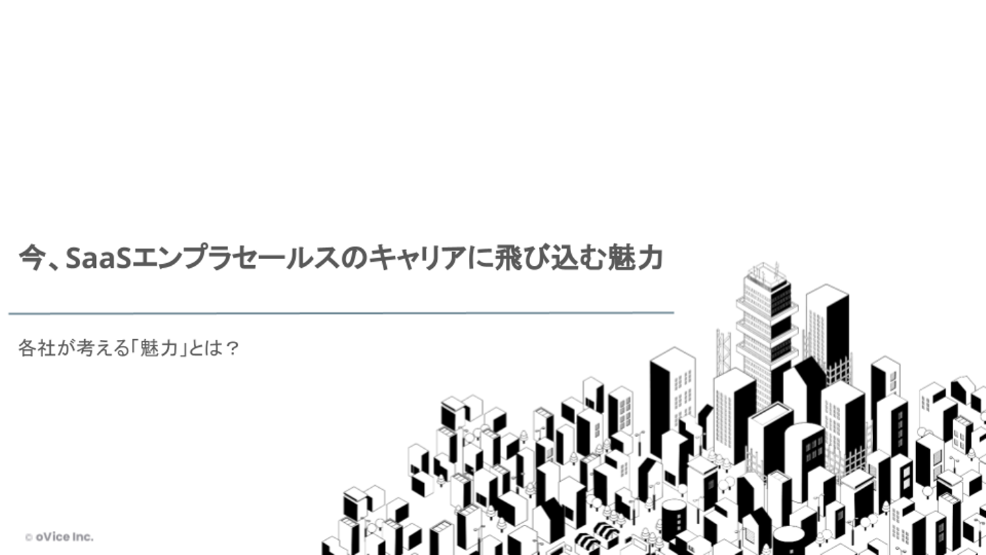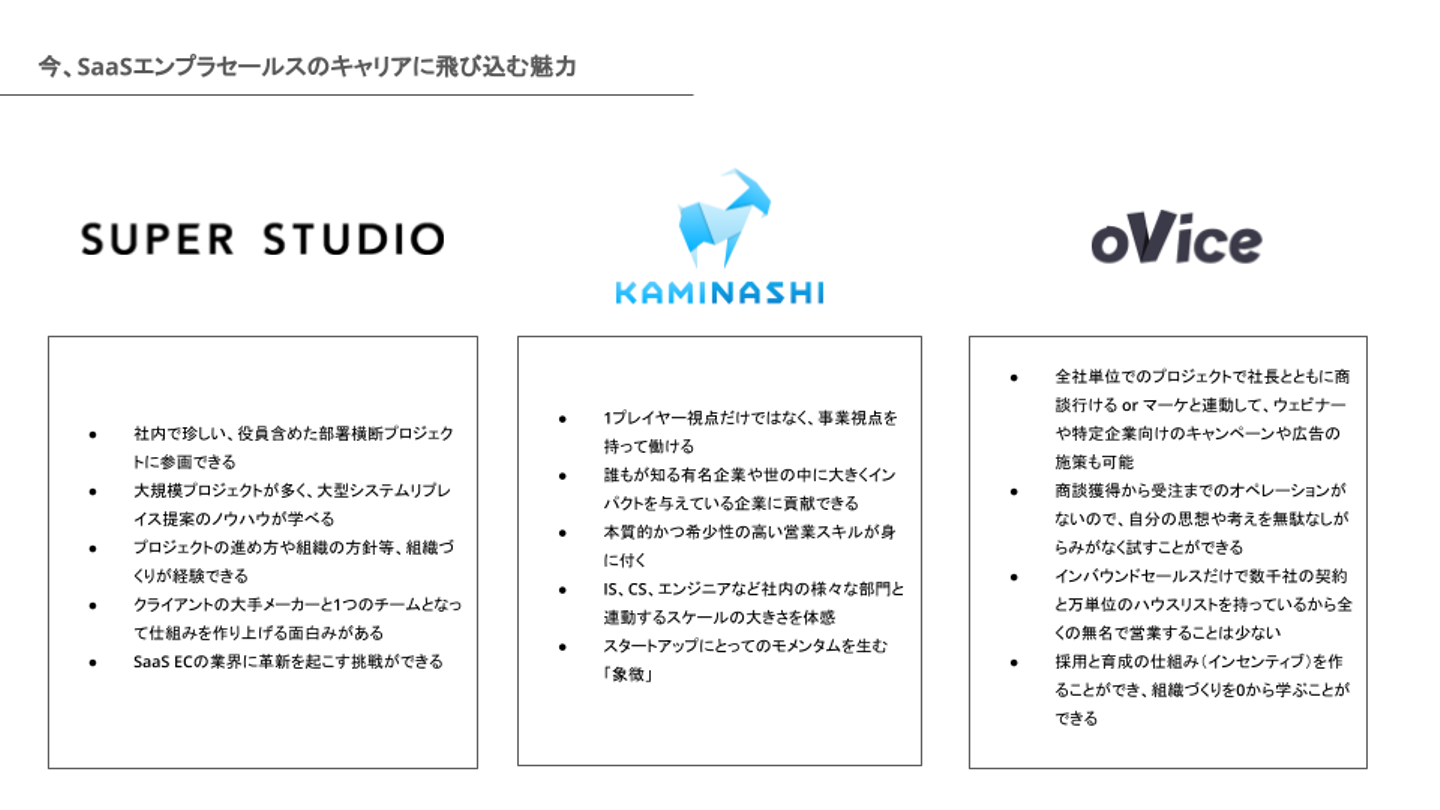 登壇者は、2021年10月にエンタープライズ専門部隊を立ち上げ、マネージャを務める株式会社SUPER STUDIOの赤木俊介さん、2020年に2人目のセールスとして入社し、VP of Sales & Marketing を務める株式会社カミナシの富澤仁さん、創業期に入社しJapan Biz Headとして事業統括の役割を担うoVice株式会社の重神咲也の3名。