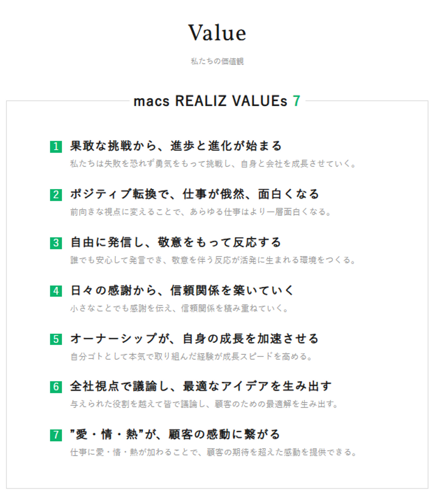 ーーそんなチームワークの中で、仕事をする上で大切にしている「macs REALIZ VALUEs7」について、皆さんが特に心がけていることはありますか?