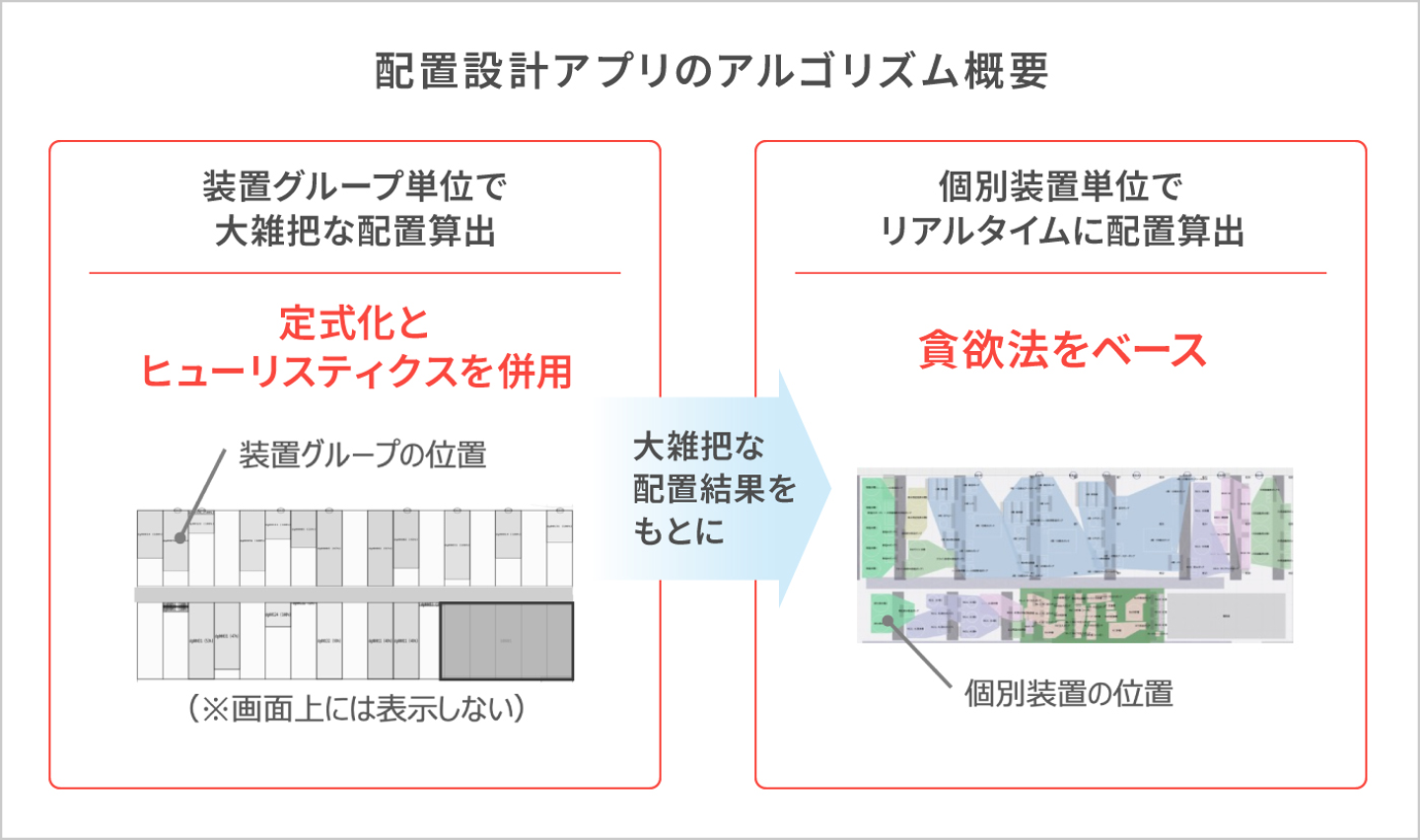 「最初は定式化を使って、いきなり一つひとつの装置の配置を決めようというアプローチを試しました。でも、小さい区画だけで計算にすごく時間がかかり、プラント全体となると現実的ではない。定式化だけでいくことはやめました。貪欲法もやってみましたが、精度の高い答えを短い計算時間で出すことは難しかった。そこで、近似的な解を得られるヒューリスティクスを、定式化と併用することにしました。まずは装置グループ単位で大雑把な配置を算出して、その後に一つひとつの装置の具体的な位置を決めていくというやり方です」。