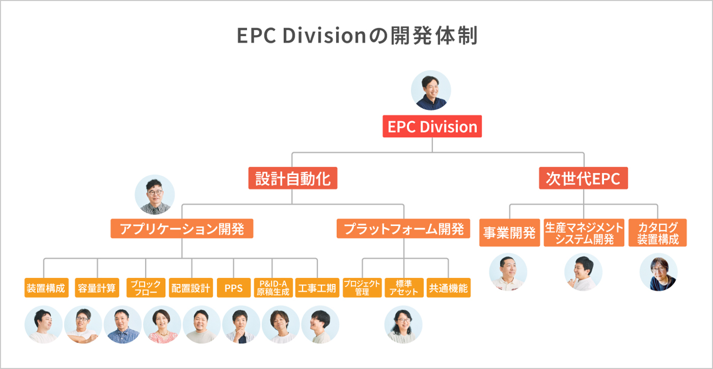 「基本設計を分解したプロセスごとに、『装置構成』『容量計算』『ブロックフロー』『配置設計』などの7つのアプリケーションを開発しています。このアプリケーションごとにワーキンググループがあって、それらを連携するワーキングも含めると8つのワーキングがあります。さらに横のつながりをスムーズにするための『プラットフォーム開発』を行うチームもあって、横に長い組織なのが特徴です」。