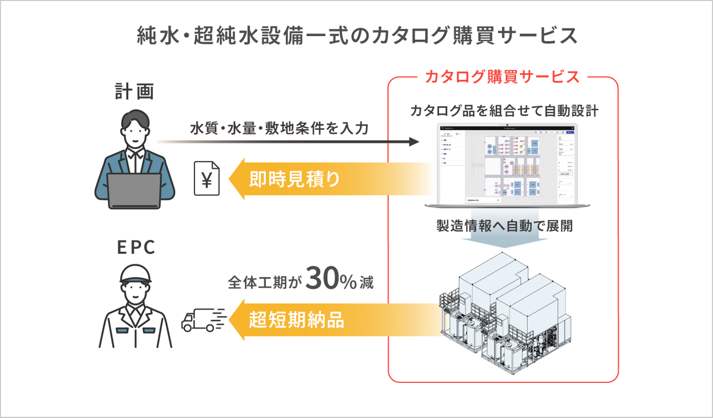 「設計自動化がフルオーダーメイドの水処理プラント設計をサポートするものであるのに対して、検討を始めている『次世代EPC』は、レディメイドのEPCです。今後7年で2倍になると言われている電子産業の水処理プラントニーズに応えていくには、すべてをフルオーダーメイドで応えるのではなく、レディメイドの設備をカタログ購買できる仕組みが必要になると私たちは見込んでいます。複数の装置を並べてつないだ水処理プラント一式をレディメイドで提供するという考え方と、私たちの設計自動化技術を活用してシミュレーションや配置を支援するという考え方で、プロトタイプをつくっての検証や、生産・販売の仕組みづくりを進めています」。