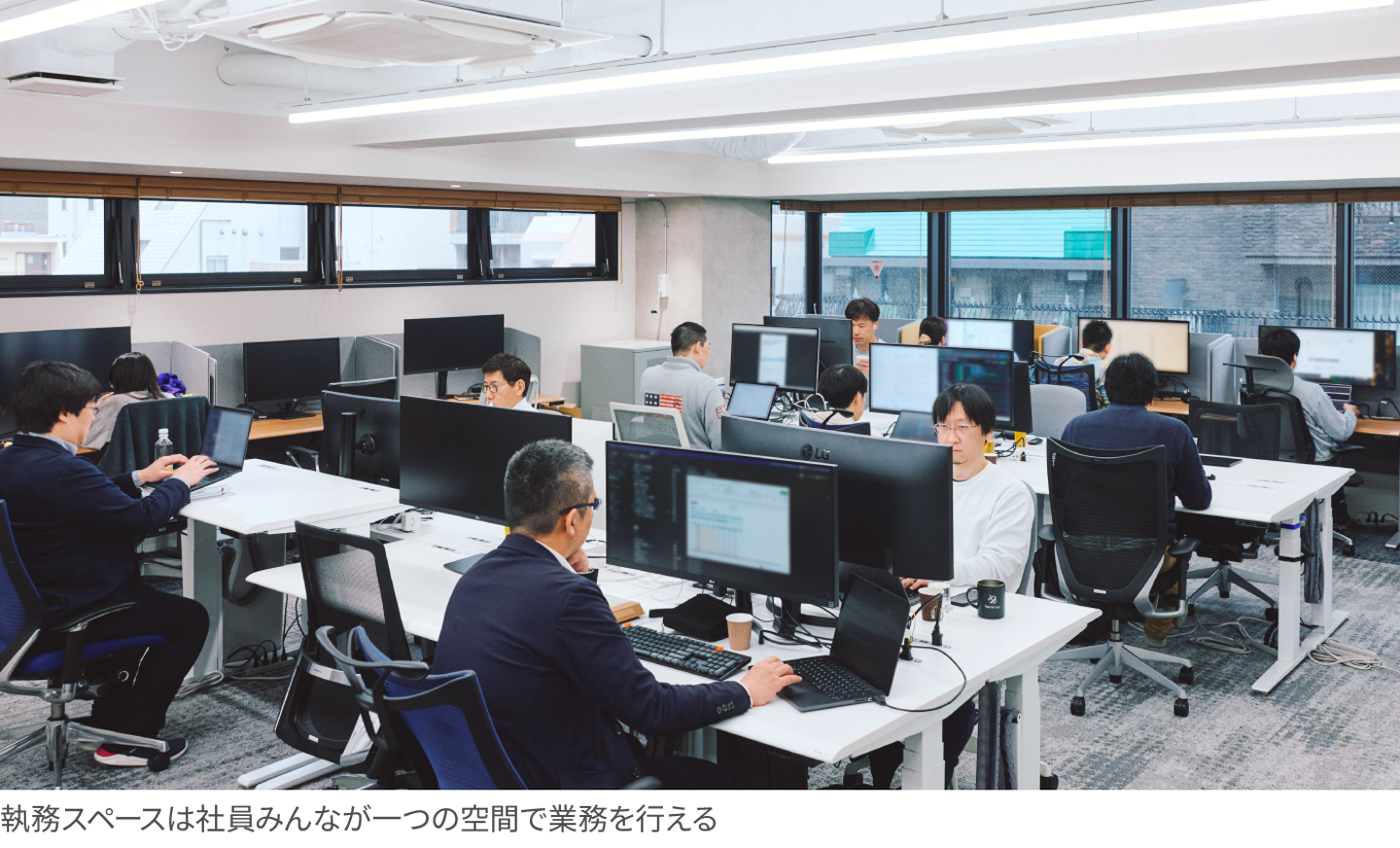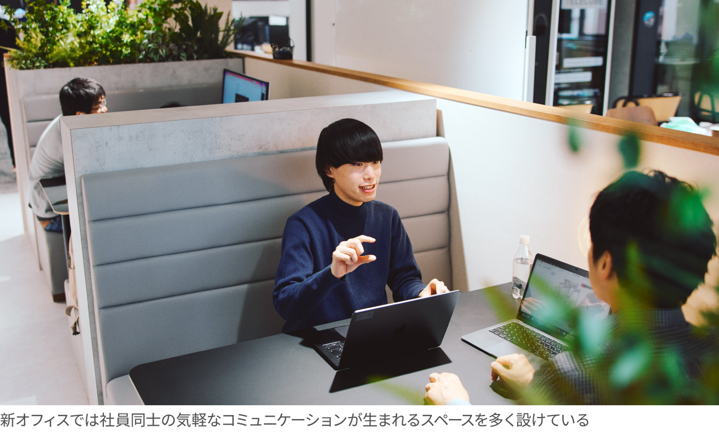 「そうですね。数年に1回、こうやってみんなで自分たちのオフィスのあり方を話し合って、できることを拡充したり、働きやすいように制度をアップデートしたりする機会は大事だと感じました。話し合いながら自分たちで脱皮していくような機会は、これからも意図的につくったほうがいいと思っています。結果的に新オフィスは気軽にディスカッションできる場所をだいぶ増やしました。お客様とのミーティングに使える2つのクローズドな会議室だけでなく、気軽に話し合えるファミレス席と呼んでいるブースもあります。執務スペースと会議スペースは完全に壁で分かれておらず、どこかで誰かが話している声が聞こえるくらいのオフィス構造です」。