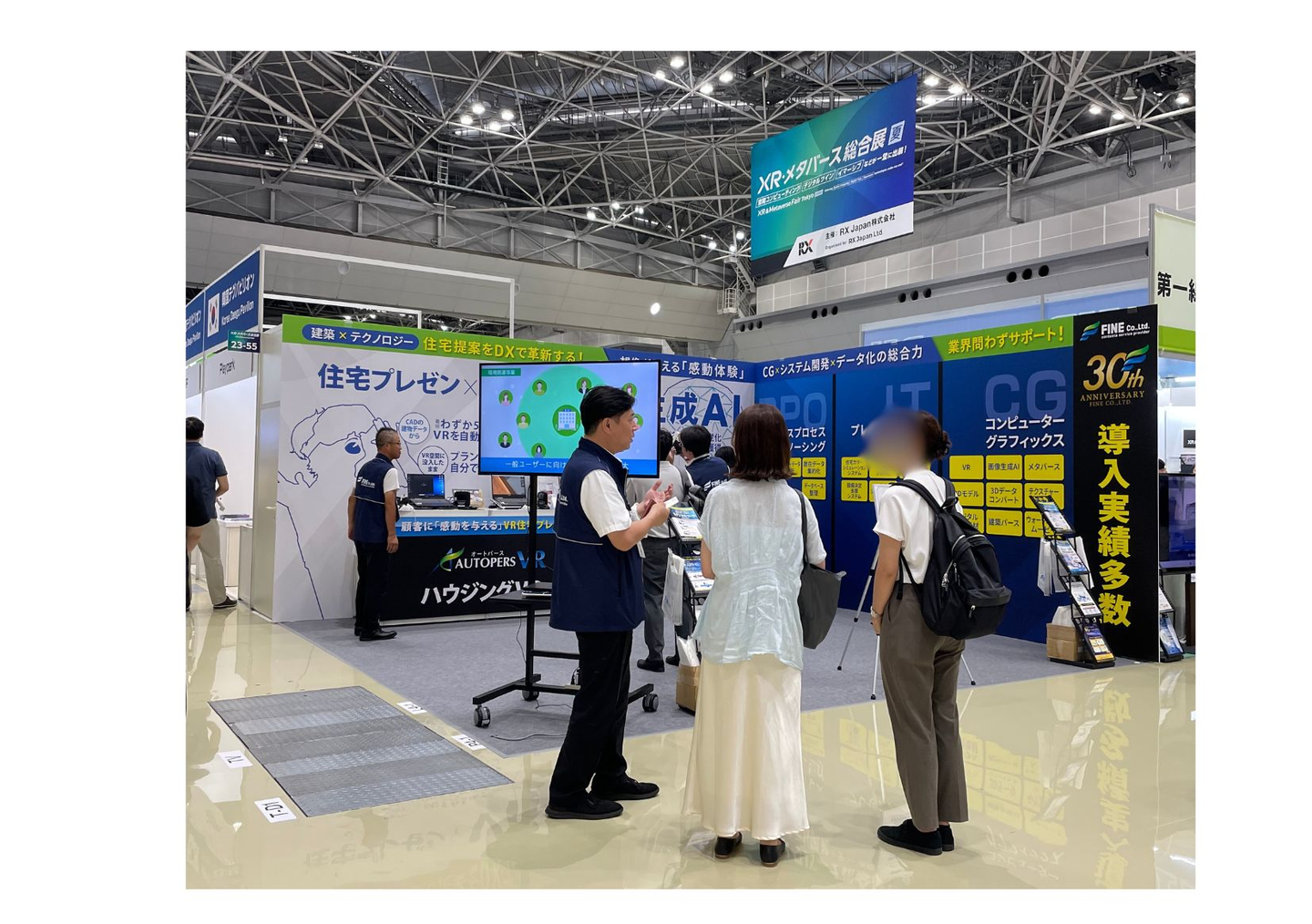 弊社のブースではVRや画像生成AIをはじめ住宅販売シーンでの集客、プレゼン、仕様決定と幅広くご活用いただける各種システムを紹介し、暑い中でしたが、多くの方にご来場いただきました。
