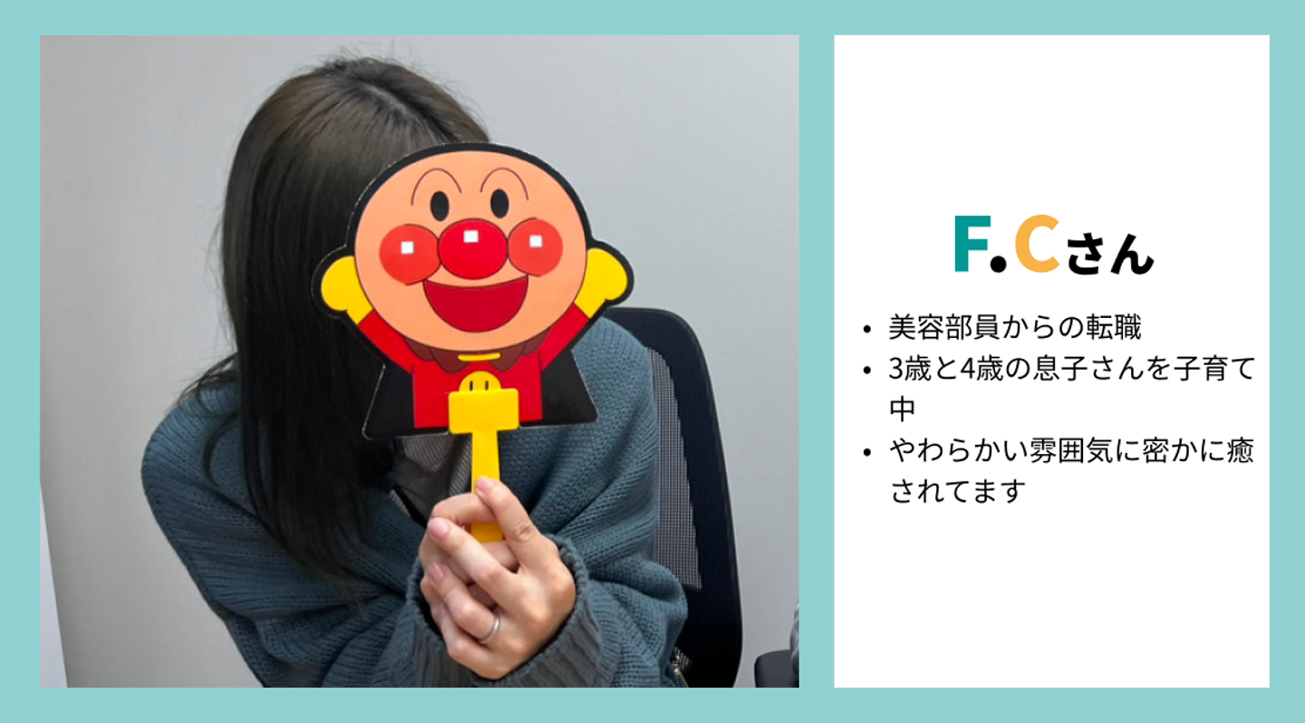 F.Cさん:美容部員時代も当初は時短勤務で働いていたのですが、2人目を産んだ後に会社の体制が変わって異動があり、今までの働き方ができなくなってしまったことで転職を考えるようになりました。帰りが22:00になってしまうこともあったり、夫と調整をしたり、実家の母に静岡から来てもらったり…頑張っていたのですが、だんだんとうまく回らないことが増えてしまって。今の働き方のままでいいのか色々考えるようになったときに、もともとPCが好きだったことや、父が技術者だったこともあってIT業界に転職したいと思いました。