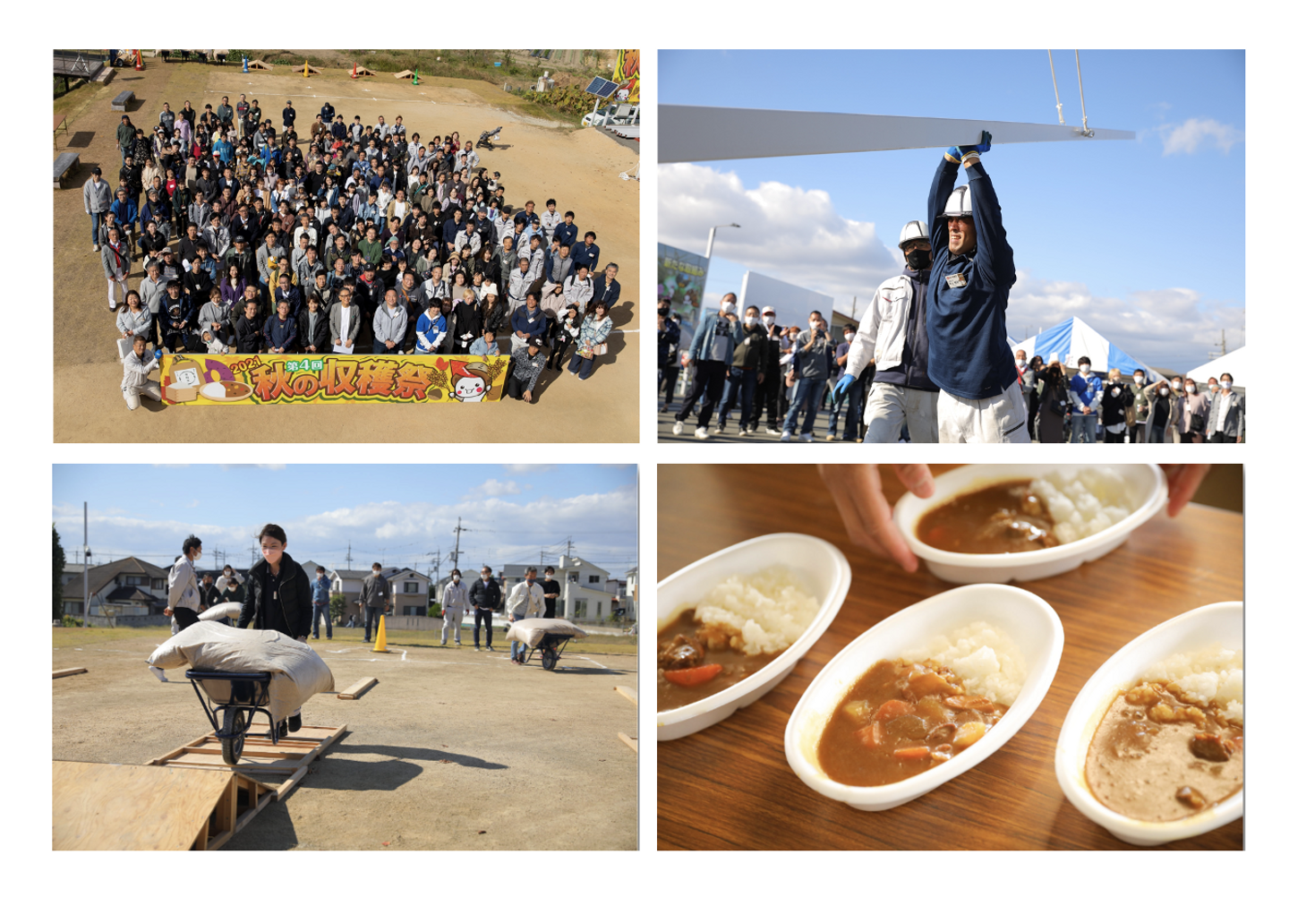 10月に開催している収穫祭では、当社で取り組んでいる農業での豊作を祝って、全社員とその家族を招待してカレーの振る舞いや障害物レース、看板に使われる柱起こしなどを行う終始盛り上がるイベントとなっています。