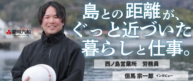 隠岐諸島の島々を結ぶフェリーは、観光だけのためにあるわけではありません。島の暮らしそのものを支える「生活インフラ」です。郵便物、商店の荷物、生活物資。島の暮らしは、船が動くことを前提に成り立っています。その港で船を迎え、荷物を扱い、人と人をつないでいるのが営業所の労務員です。今回は、西ノ島営業所で働く但馬宗一郎さんに、仕事のリアルと島で働く魅力について聞きました。<プロフィール>但馬 宗一郎(たじま そういちろう)出身:島根県隠岐郡西ノ島町社歴:2019年4月入社所属:西ノ島営業所 労務員趣味:ダイビング、釣り──まずは自己紹介をお願いします。但馬:西ノ島出身で、2019年4月に隠岐汽船...