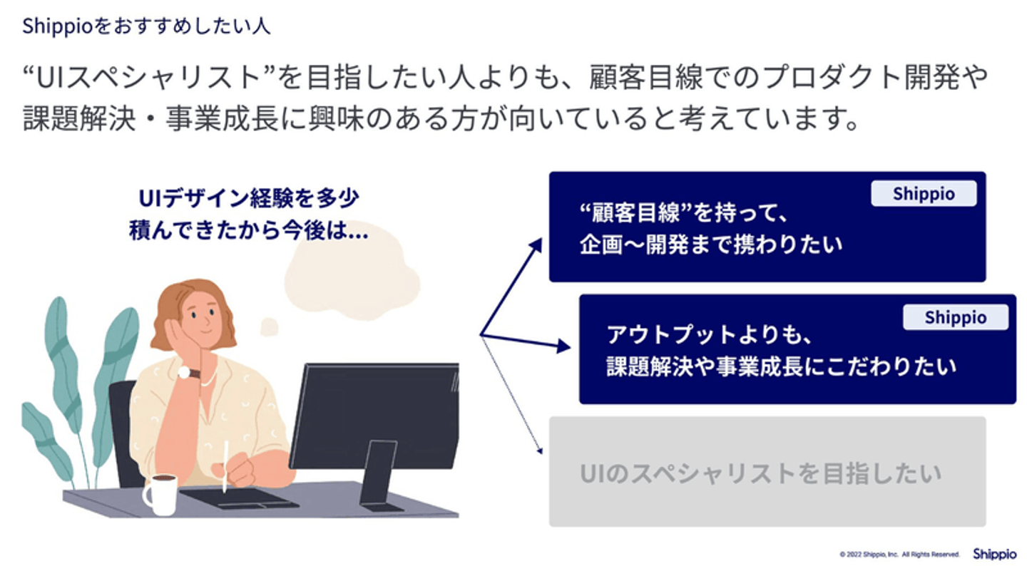 顧客目線を持って働きたい方が「Shippioとして捉えている事業・組織課題を自分の力で解決できそう」と感じてもらえることが重要だと考え、①事業課題・チャレンジ(事業として今後取り組んでいきたいこと)、②組織としてのデザイナー不足、③「対象デザイナー」(UIを極めている必要も、UX領域の経験も必要ない)をストレートに明示しました。